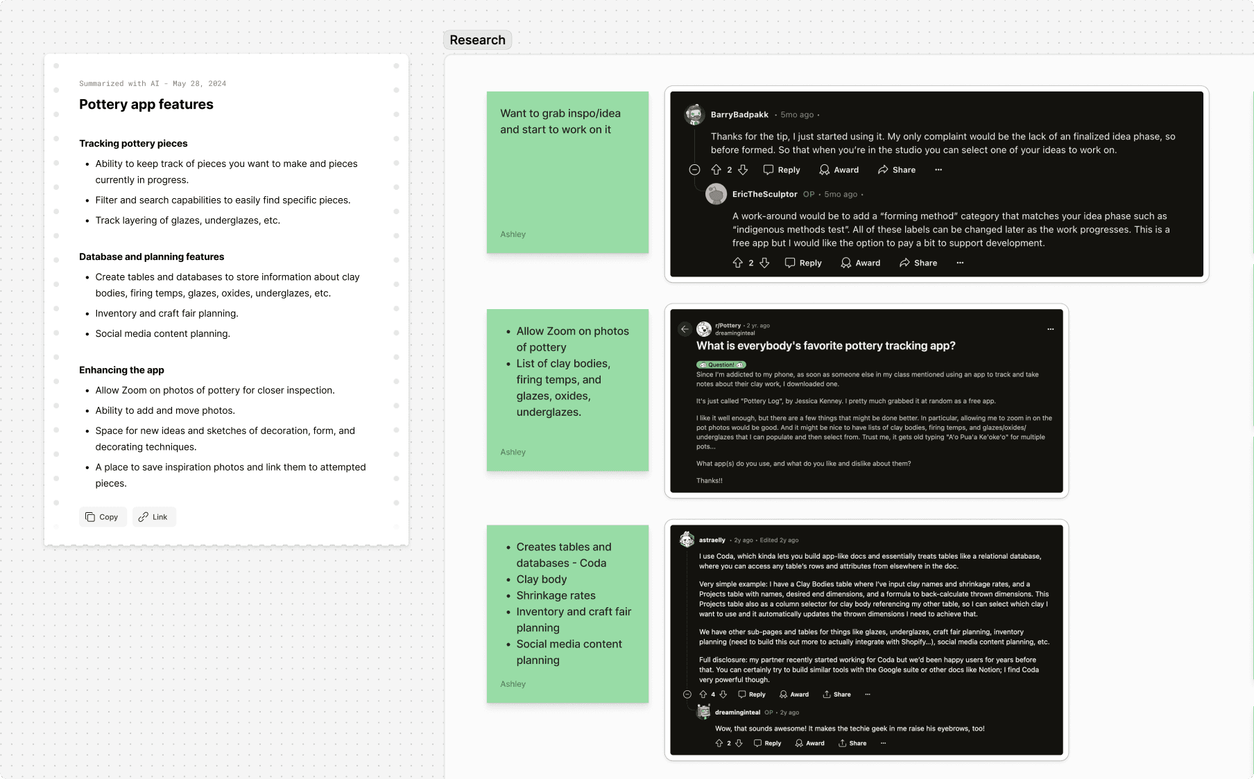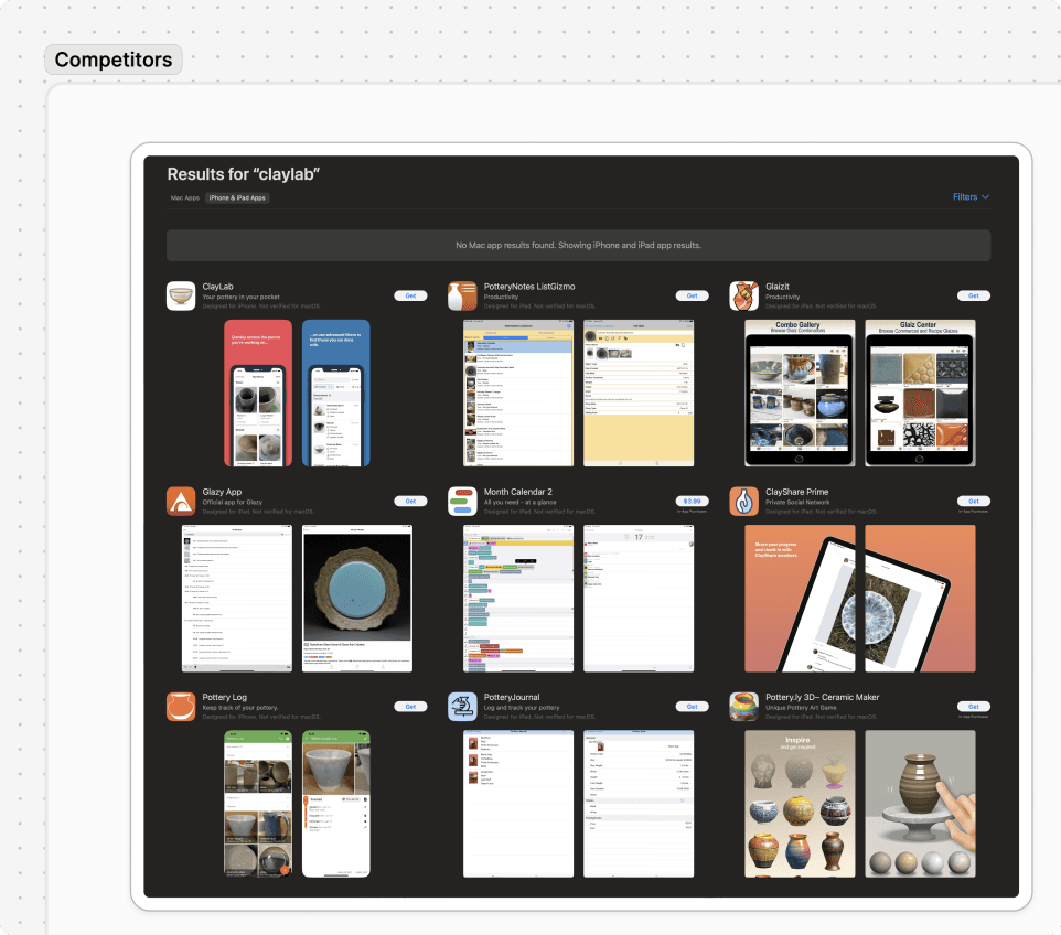 Ceramics is a grounding, meditative, and tactile hobby so those who make pottery are not typically interested in having their phone nearby during the making process. It’s an opportunity to escape tech, connect with mud, and not look at screens! Also, pottery is messy - smartphones and water do not typically mix well. I think an opportunity to explore here is making it easy for potters to do their app tasks before or after their making session.
