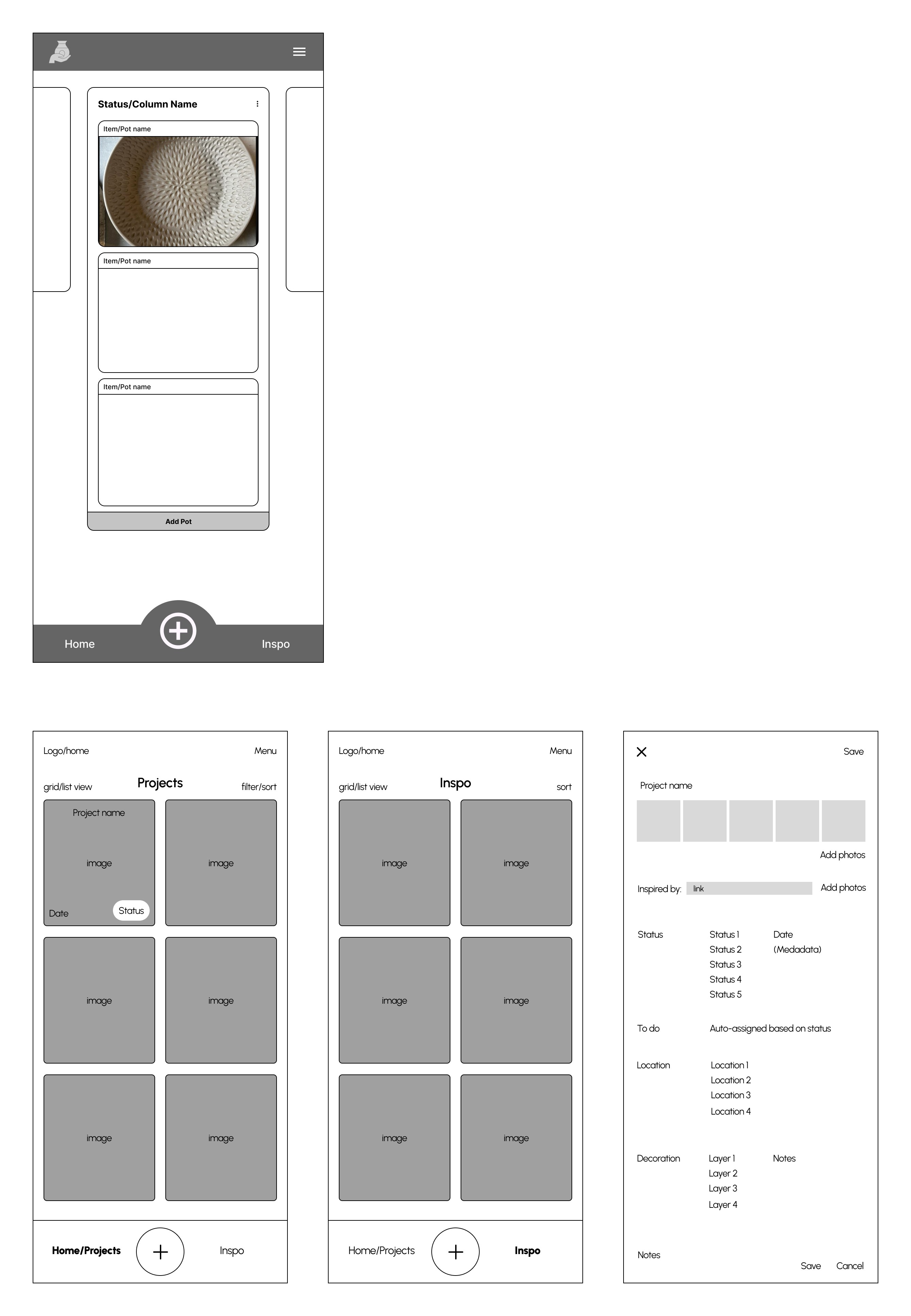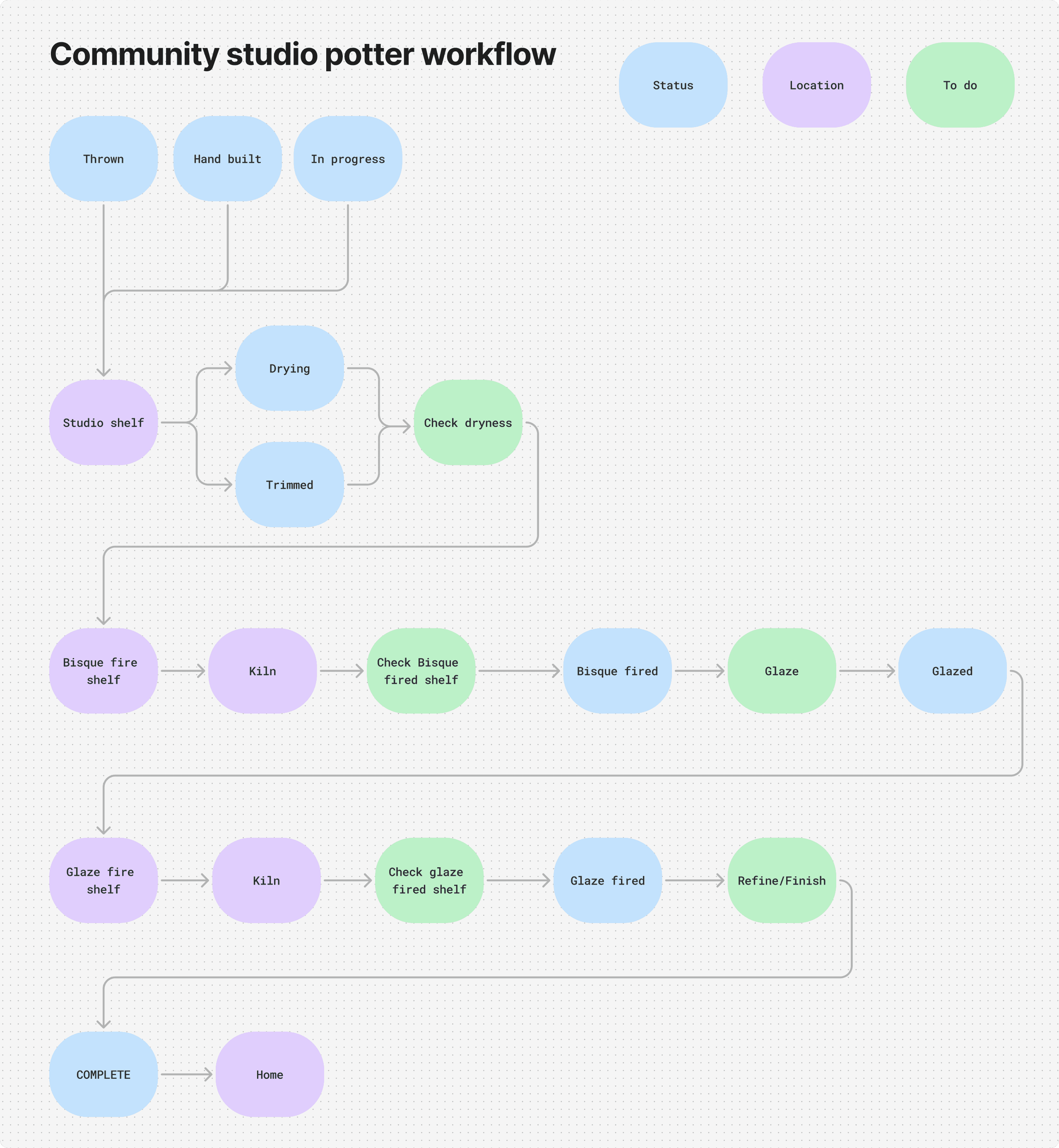 After scoping out this project, I wanted to define the moving parts of a potter's workflow to better understand where an app might be the most useful. I broke each piece of the process out into 3 segments: Status, Location, and To Do.
